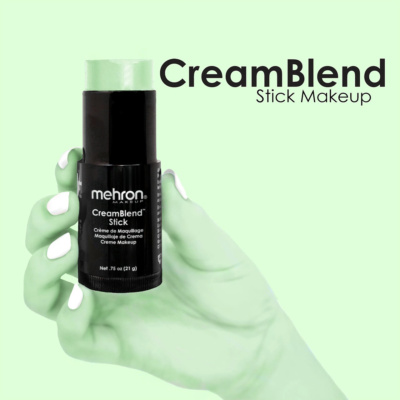 Mehron CreamBlend™ Stick Pastel Green is een zeer gepigmenteerde, verfijnde crèmemake-up in een handige uitdraaibare stick. De crème-formule met volledige dekking is ontwikkeld om te blijven zitten zelfs onder zware prestatieomstandigheden zoals hete podiumlichten. CreamBlend™ Stick bevat vitamines en antioxidanten en is geformuleerd zonder de petrolatum-basis die vaak wordt aangetroffen in traditionele greasepaint/vetschmink. CreamBlend biedt de ultieme dekking en prestatie. Verkrijgbaar in een verpakkingen van 21 gram.