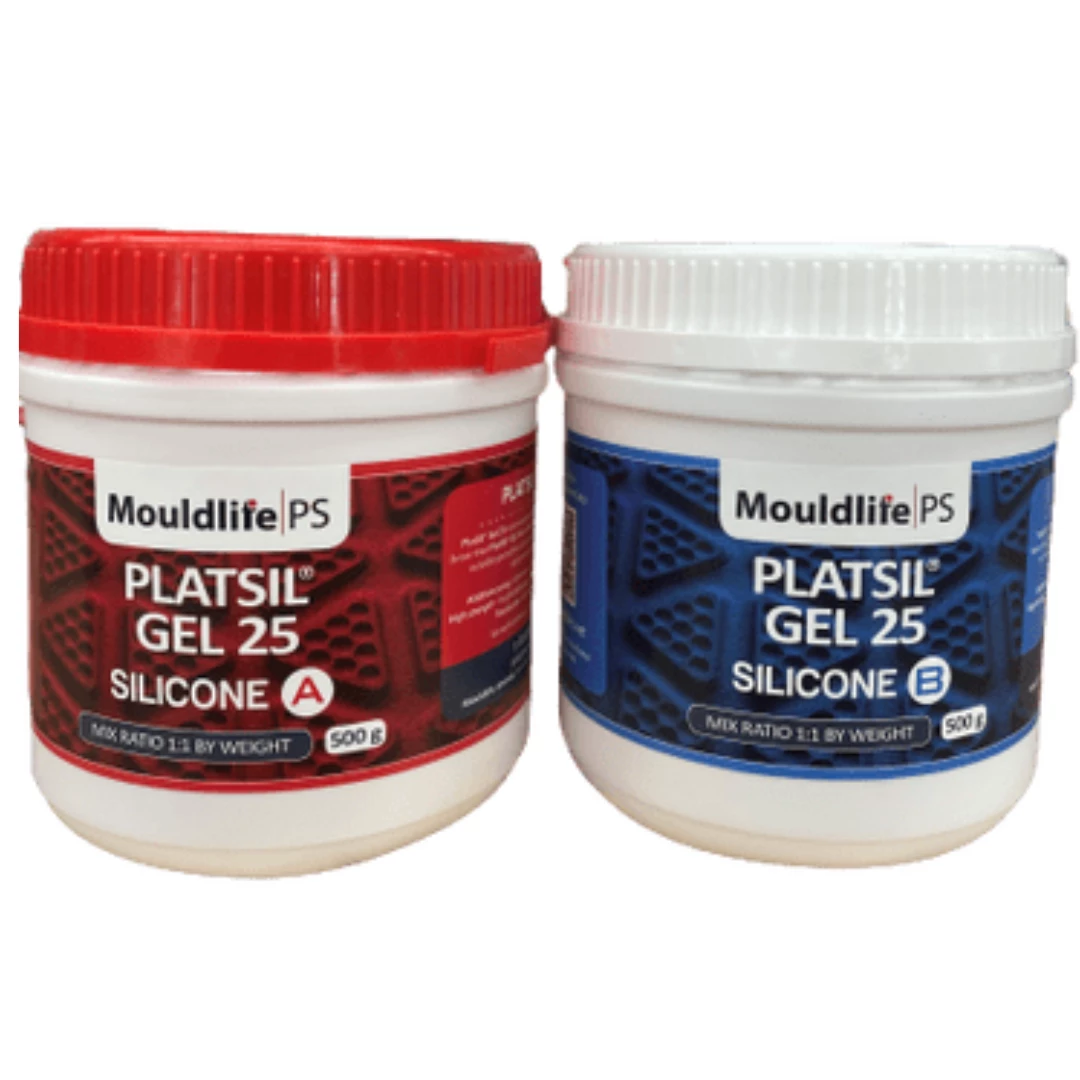 1 deel A staat tot 1 deel B (zowel in gewicht als volume) platinum-cured silicone product met een werktijd van 6 minuten en na 30 minuten kan het uit de mal. PlatSil Gel25 heeft standaard een Shore A25 hardheid, hier bedoelen we een redelijke stevigheid mee. Wil je de silicone prothese zachter hebben dan moet je niet vergeten om deadener toe te voegen. Zo maak je de silicone zachter en nog natuurlijker als je het aanraakt of als het op bewegende delen van het lichaam wordt aangebracht.