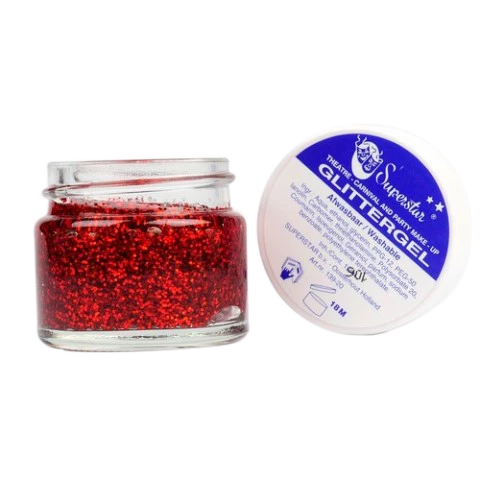 Superstar Glittergel Rood (15ml) kan je zowel op de huid als in het haar gebruiken.