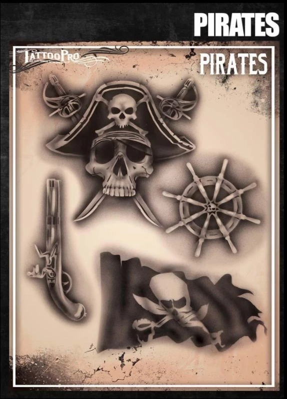 Wiser’s Airbrush TattooPro Stencil – Pirates zijn Airbrush sjablonen speciaal ontworpen door Bodypaint en Graffiti artist Wiser Oner. Van de sjablonen kun je zowel de positieve als de negatieve delen gebruiken, als je ze uit het vel drukt. Eindeloos te combineren met de andere TattooPro stensils, zodat er iedere keer weer een originele Airbrush Tattoo ontstaat.