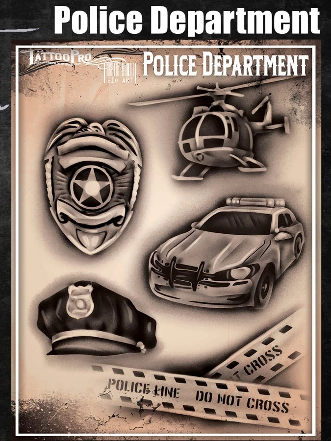Wiser’s Airbrush TattooPro Stencil – Police Departmentzijn Airbrush sjablonen speciaal ontworpen door Bodypaint en Graffiti artist Wiser Oner. Van de sjablonen kun je zowel de positieve als de negatieve delen gebruiken, als je ze uit het vel drukt. Eindeloos te combineren met de andere TattooPro stensils, zodat er iedere keer weer een originele Airbrush Tattoo ontstaat.