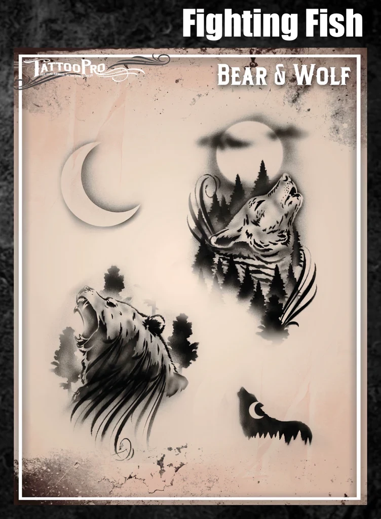 Wiser’s Airbrush TattooPro Stencil – Wolf & Bear zijn Airbrush sjablonen speciaal ontworpen door Bodypaint en Graffiti artist Wiser Oner. Van de sjablonen kun je zowel de positieve als de negatieve delen gebruiken, als je ze uit het vel drukt. Eindeloos te combineren met de andere TattooPro stensils, zodat er iedere keer weer een originele Airbrush Tattoo ontstaat.